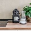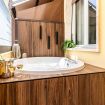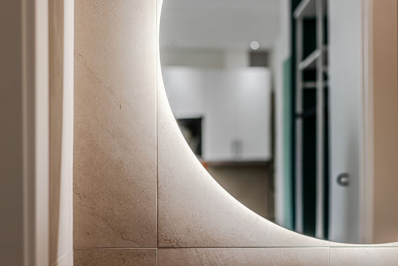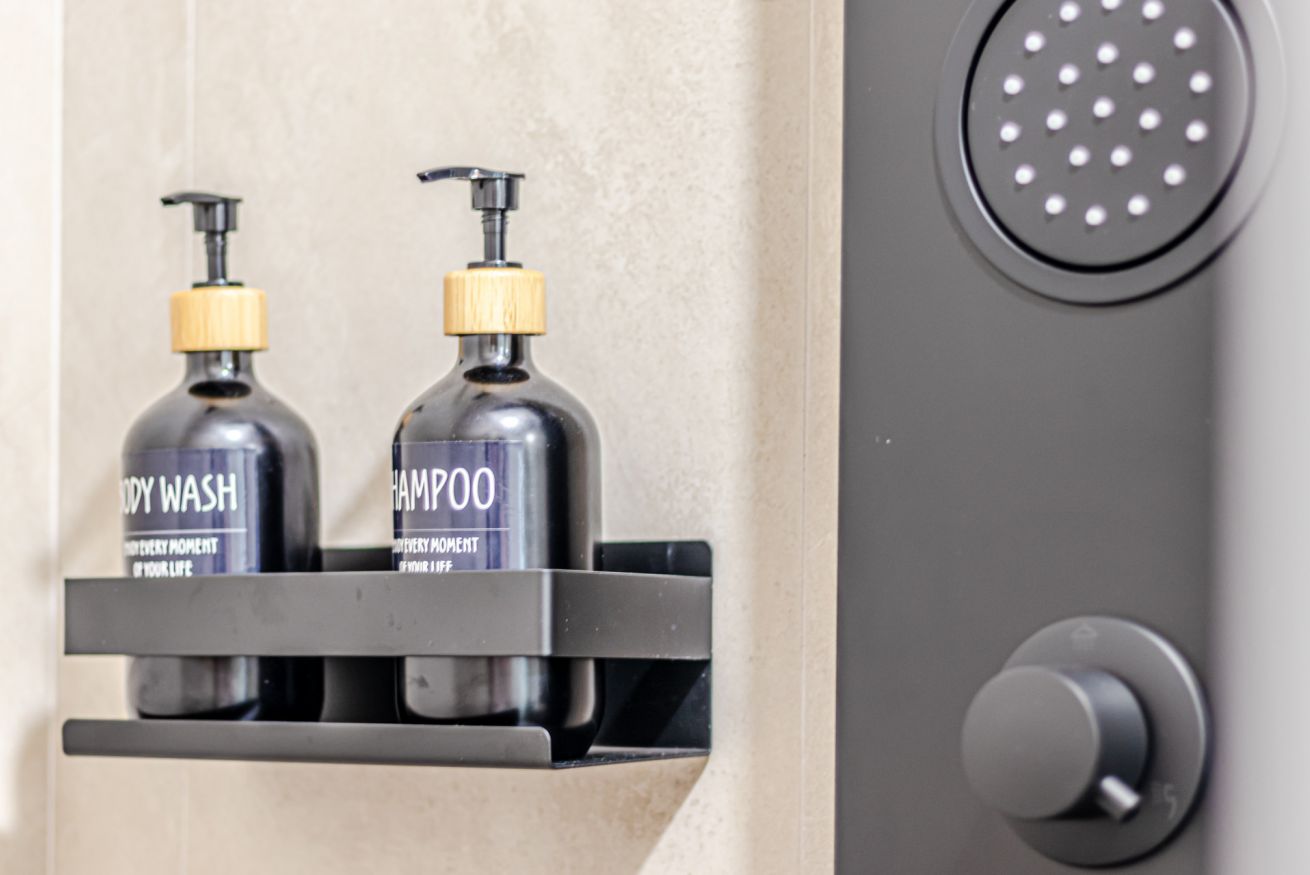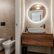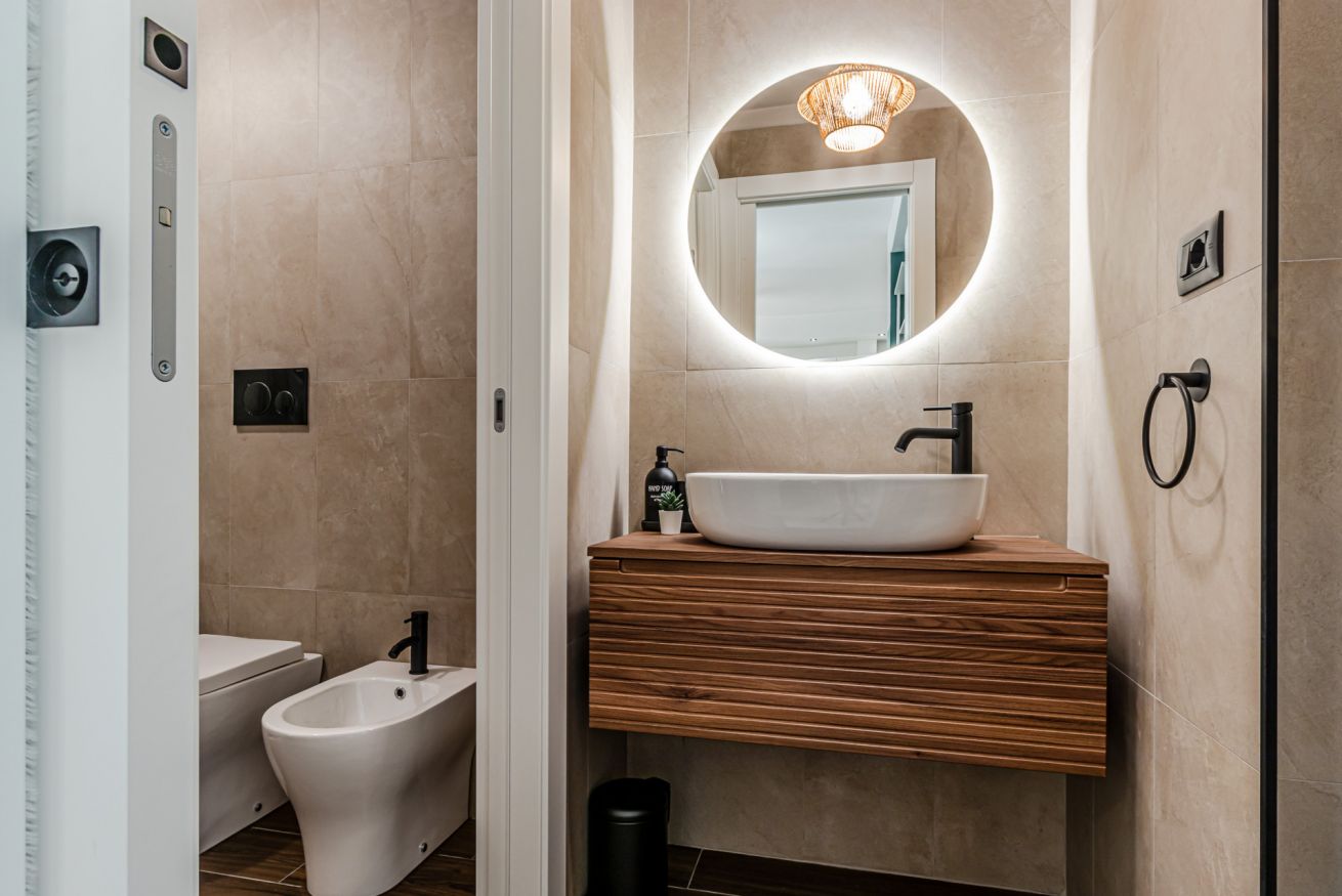 Lo splendido bagno in stile boutique scandinavo è dotato di doccia con getti idromassaggio e a cascata. Lo specchio retroilluminato, il paralume in paglia e il lavabo in appoggio con rubinetteria nera donano al bagno classe ed eleganza.