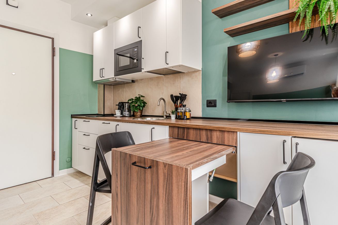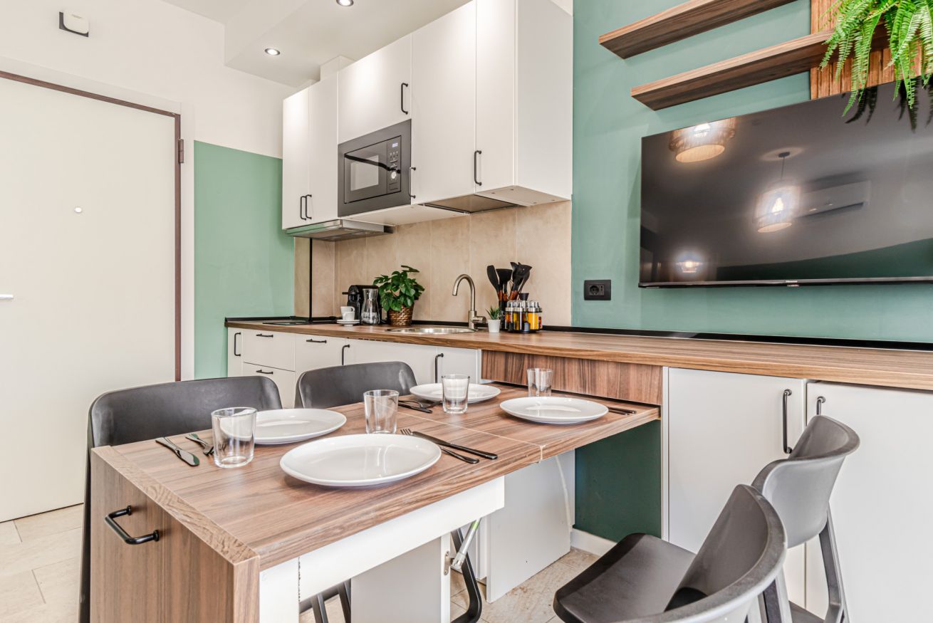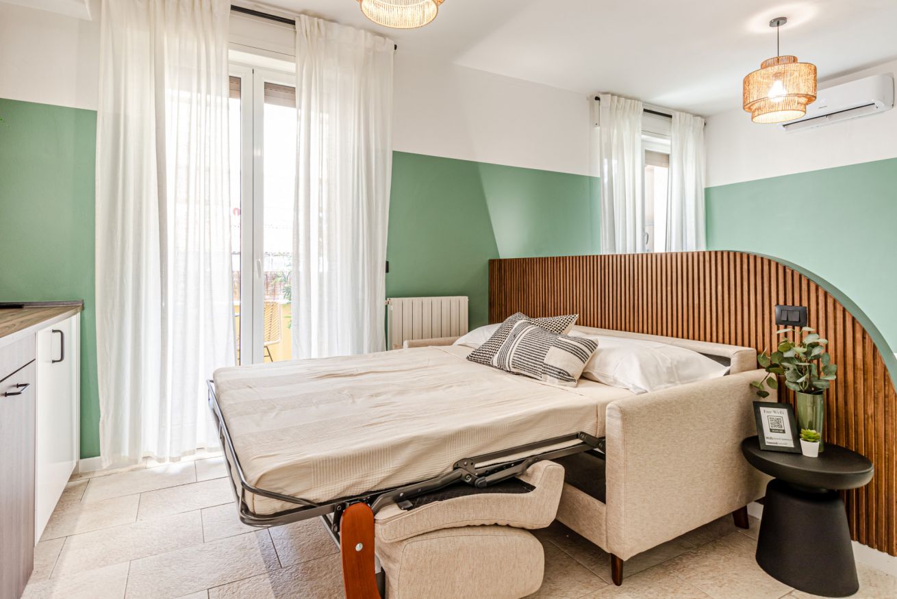L’alloggio è composto da un monolocale ove è ubicata la moderna zona giorno con angolo pranzo, divano-letto e TV. La TV è dotata di tecnologia Smart-TV ed è quindi possibile utilizzare il proprio account Netflix e Amazon Tv.