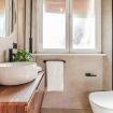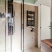 Lo splendido bagno in stile boutique scandinavo è dotato di doccia con getti idromassaggio e a cascata. Lo specchio retroilluminato, il paralume in paglia e il lavabo in appoggio con rubinetteria nera donano al bagno classe ed eleganza.